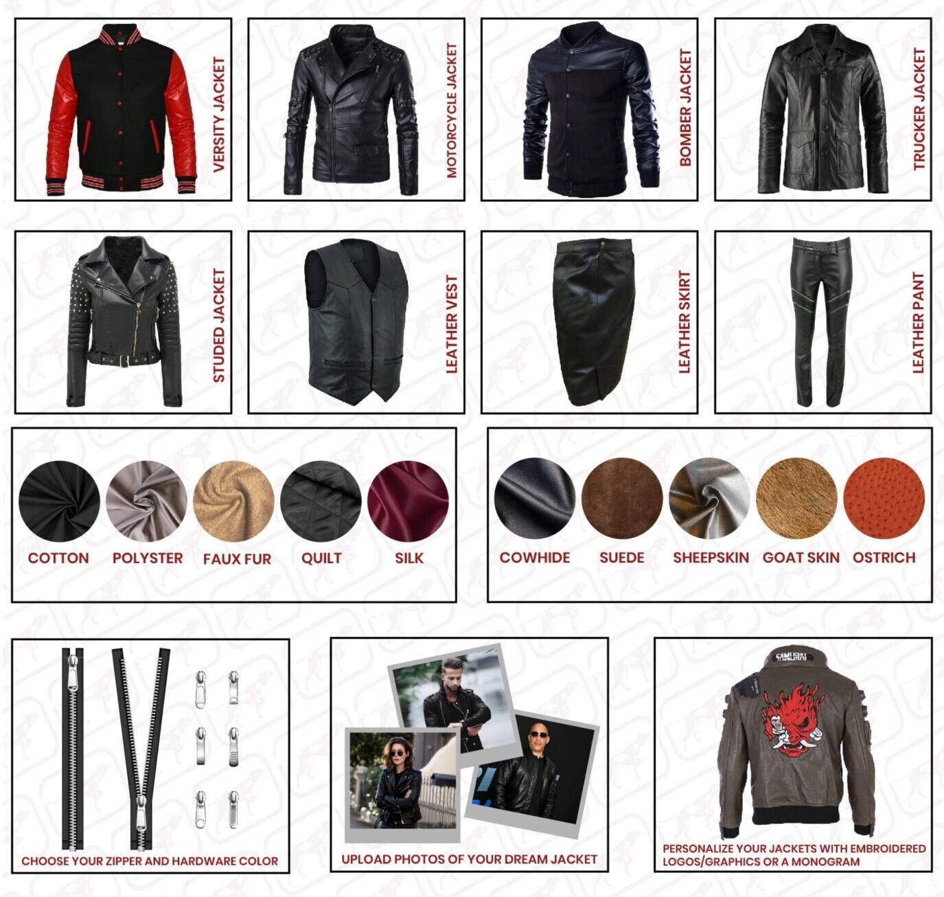 At SecondarySkin, customization doesn’t stop at fit and fabric. Add signature touches that make your jacket, bag and shoes truly yours from laser-engraved metal tags to inner-lining prints, custom embroidery, or embossed logos. We also offer team, corporate, and event personalization that allowing you to wear your brand identity with confidence. Whether you want to recreate a movie-inspired look or build a one-of-a-kind piece, every design is customized to reflect your personality, values, and vision.