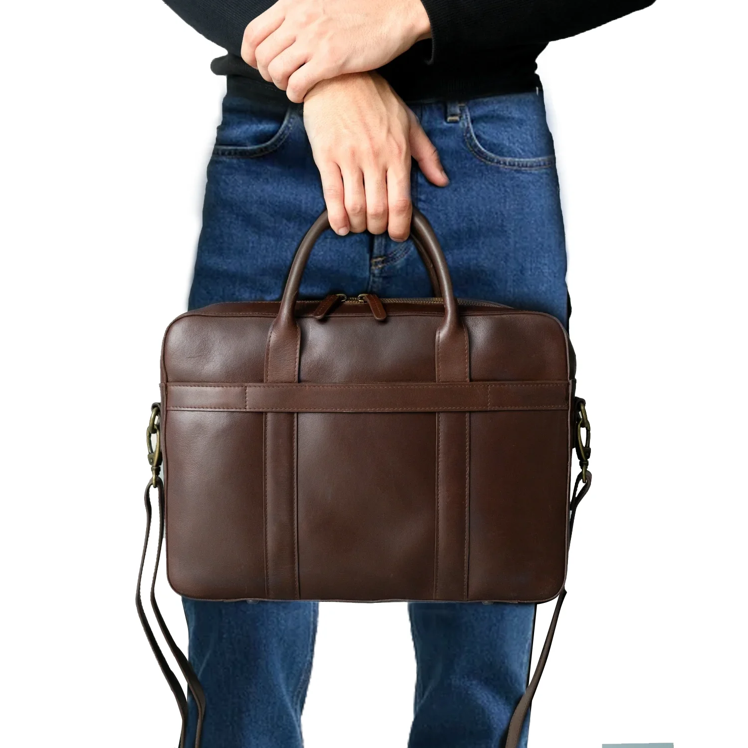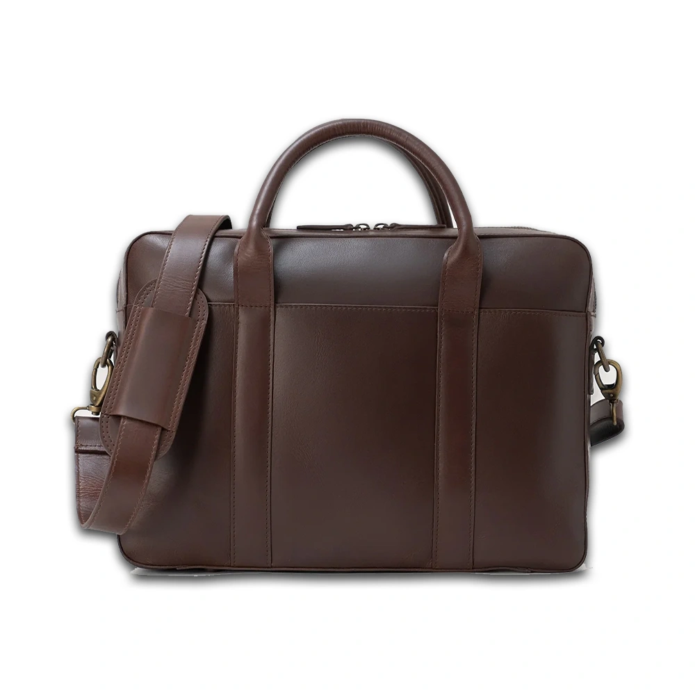 Designed for convenience, the TruCarry statement bag is crafted with a sturdy base and protective metal feet. This sleek leather briefcase features a premium cotton twill lining, reinforced with durable top stitching for a refined structure. Equipped with detachable leather shoulder straps and soft-grip handles, it ensures effortless portability. It is the ideal travel companion because of the additional trolley strap that firmly fastens to your luggage.. With ample storage, it includes a dedicated laptop compartment, cardholder, phone pocket, pen loops, and multiple sections to keep your essentials organized.